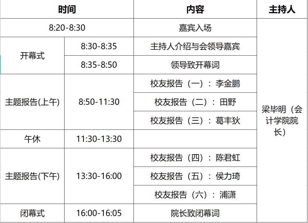 尊敬的各位校友:您好!为汇聚校友力量,凝聚校友情谊,赋能学院发展,由吉林财经大学会计学院主办的第二届校友论坛暨《开学第一课》拟定于2023年9月15日上午8点半在图书馆报告厅召开。本次校友论坛以“校友职业面对面:共话成长与梦想”为主题,现诚挚邀请您莅临本次论坛!联系电话:0431-84539348会计学院第二届校友论坛暨《开学第一课》日程安排嘉宾简介李金鹏李金鹏,中共党员,曾就读于吉林财经大学会计学院会计1228班。大...
